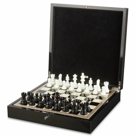 The wooden box is finished with genuine inlaid carbon fibre – the same material that’s used to make sports cars lightweight and fast…and beautiful, too. Lift the lid to reveal a beautiful wooden chess board, ready and waiting for you to pick up one of the set’s beautifully crafted wooden pieces, which sit beneath the board when not in use, and make your first move.