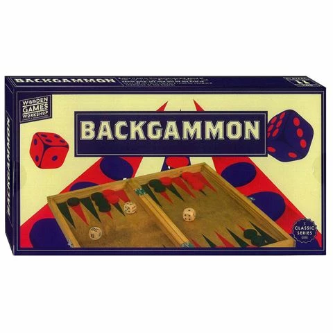 Set contains: Folding wooden backgammon board, thirty wooden game pieces, four dice, doubling cube and instruction leaflet