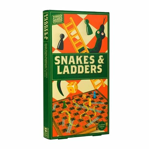 Set contains: Folding wooden snakes and ladders board, two dice, four game pieces and instruction leaflet.